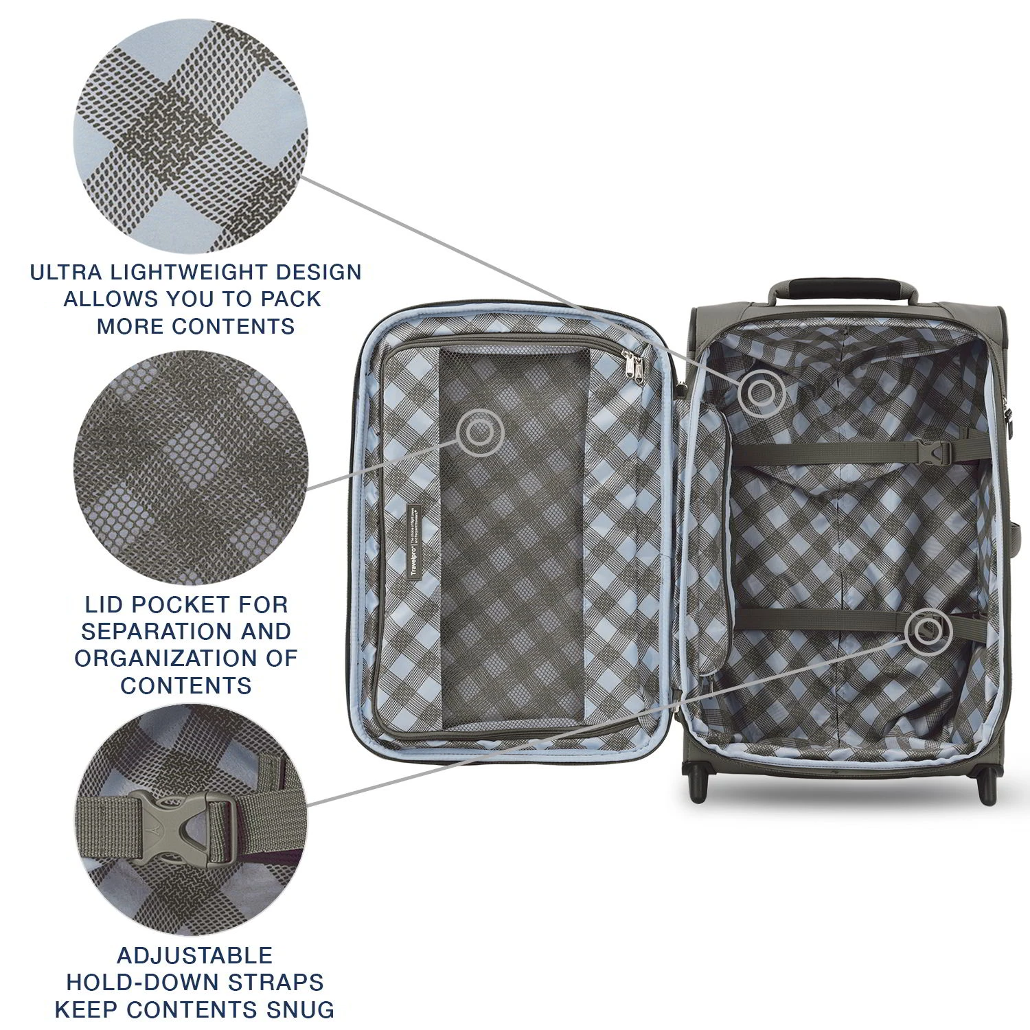 - Two exterior compartments, full-length interior lid pocket, side accessory pocket and adjustable hold-down straps allow packing convenience and flexibility
